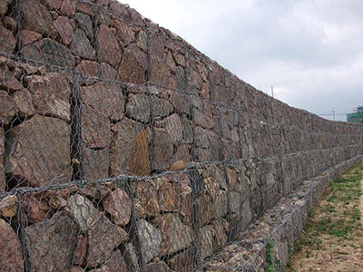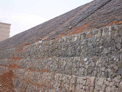 格賓擋墻是將符合要求的石料填充到具有柔性的格賓網(即六角矩形網箱)中,使整體具有一定的孔隙率、逐層堆砌的一種新型的柔性擋土材料。格賓擋土墻多用于受水流沖刷和風浪侵襲,水土流失嚴重的護坡、護岸、護堤工程。又因其造價低、生態性好、適用性強、具有一定的柔韌性等特點得到了越來越多的應用。